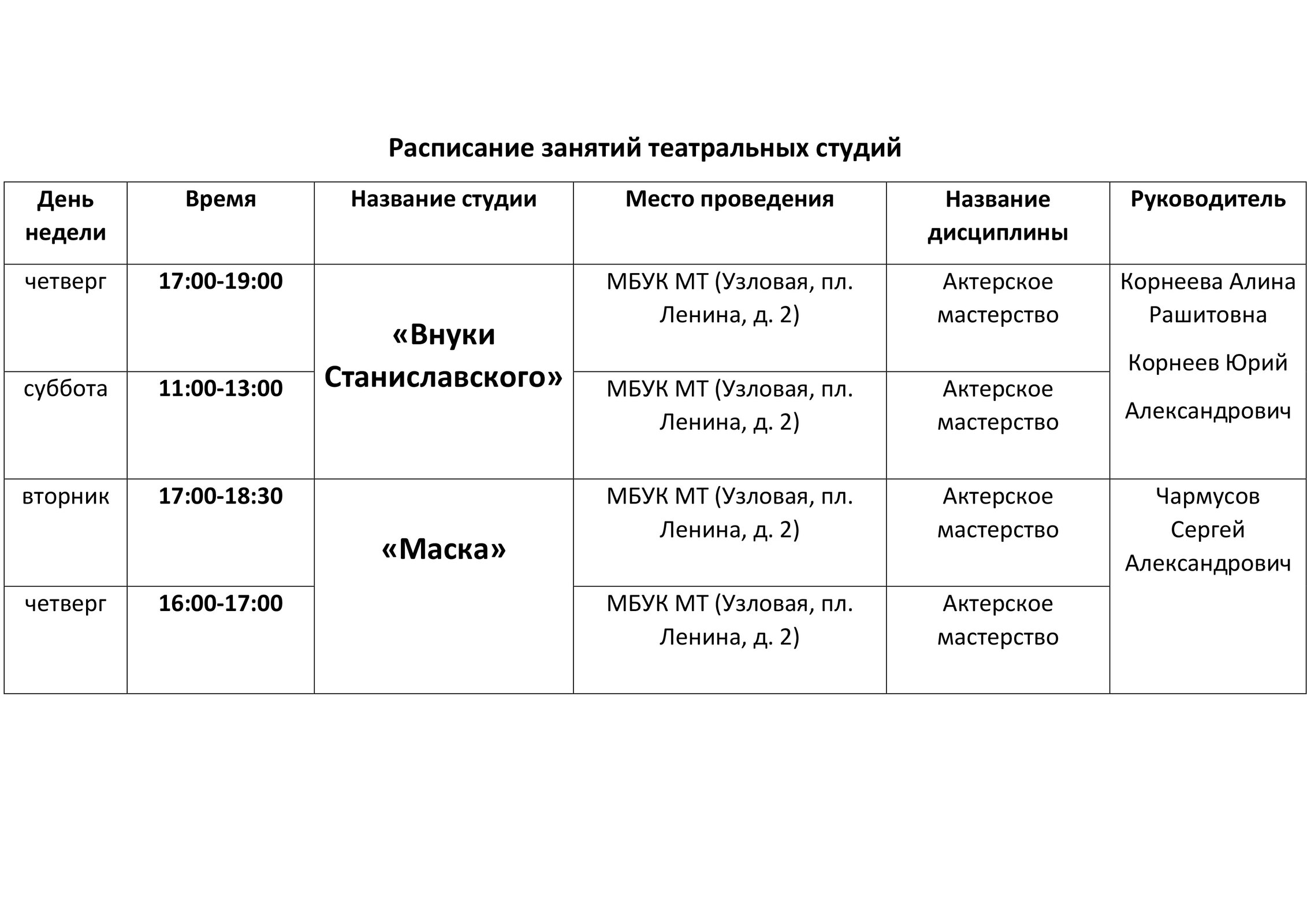 ГРАФИК РАБОТЫ ТЕАТРАЛЬНЫХ СТУДИЙ