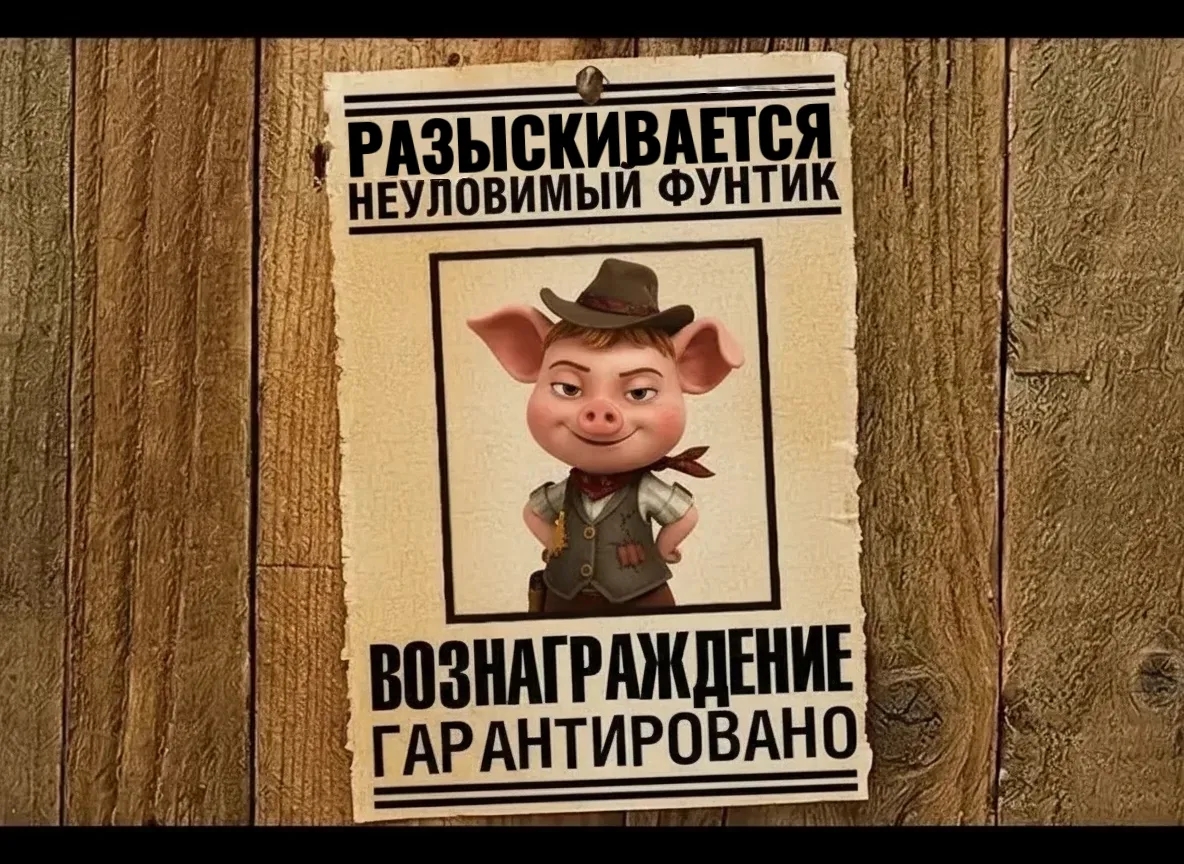 "Внимание! Внимание! Разыскивается опасный преступник — поросенок Фунтик! Особые приметы: хвостик, пятачок, белая панамка! Путешествует на автомобиле в компании подозрительных фокусников и животных!».