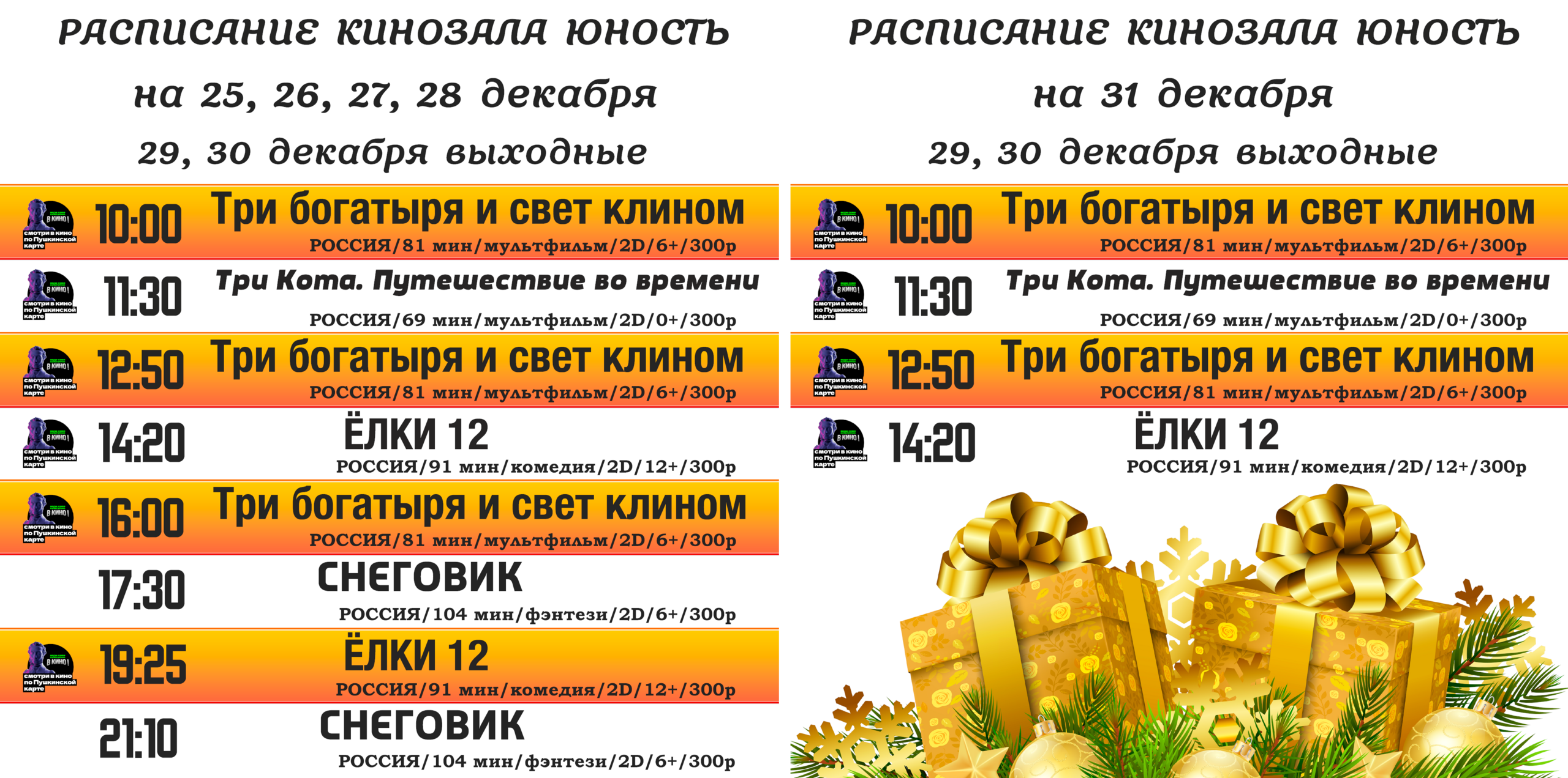 Расписание кинозала "Юность" на 25, 26, 27, 28, 31 декабря.