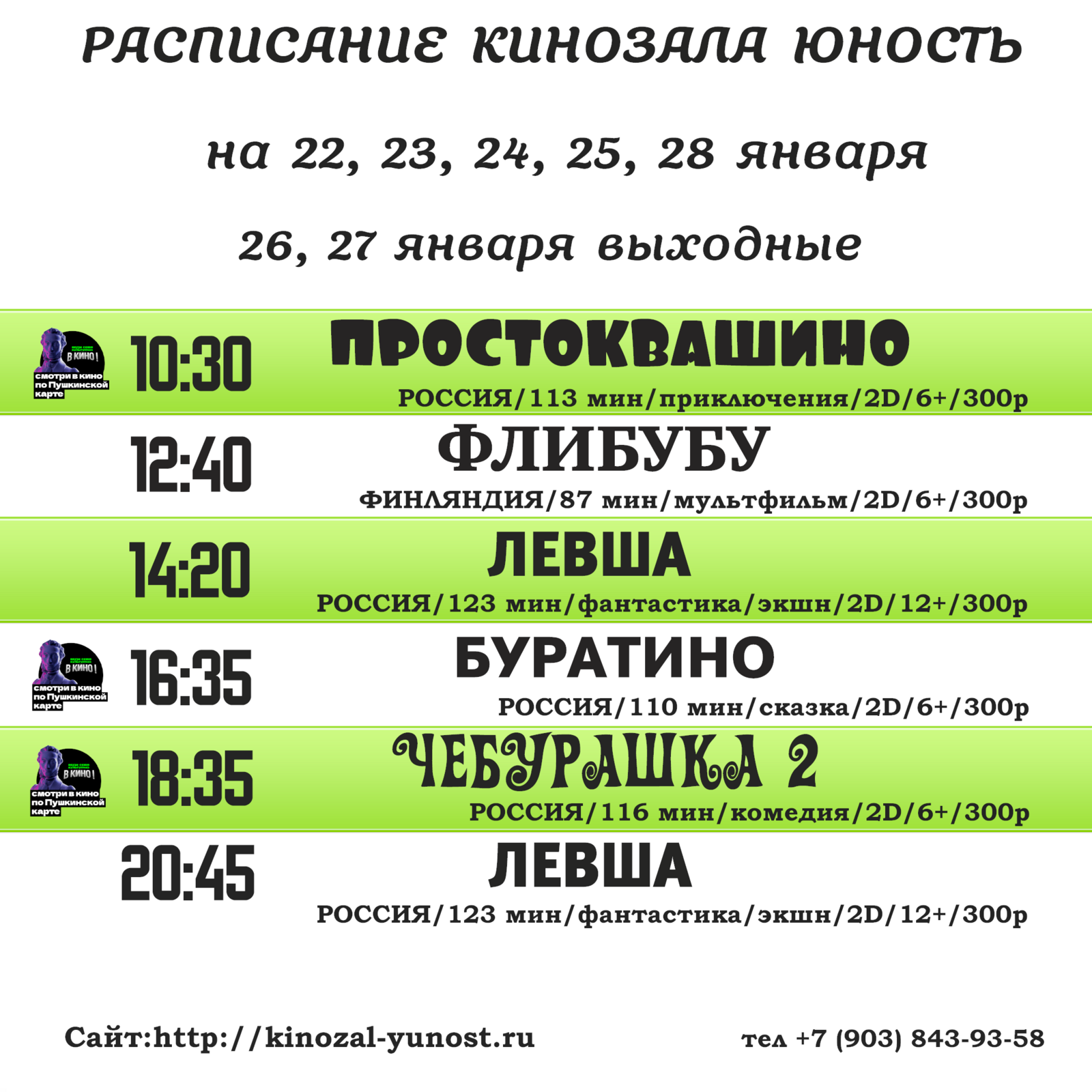 Расписание кинозала "Юность" на 22, 23, 24, 25, 28 января