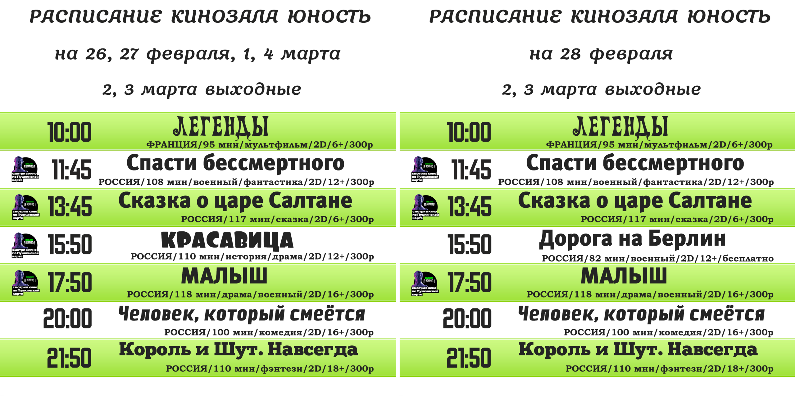 Расписание кинозала "Юность" на 26, 27, 28 февраля, 1, 4 марта