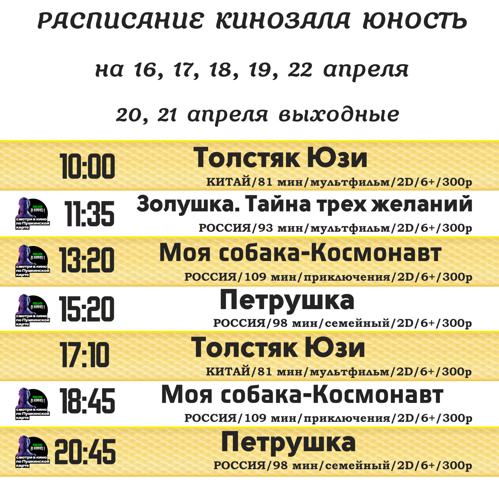 Расписание кинозала "Юность" на 16, 17, 18, 19, 22 апреля.